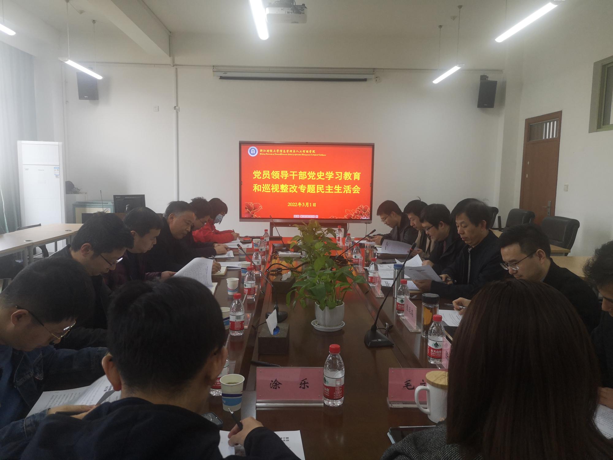 3月1日下午,信息管理与人工智能学院在9号楼404会议室召开党员领导干部党史学习教育暨巡视整改专题民主生活会。学校第五督导组组长蔡国金,督导组成员吴玻、高灵,学院领导班子成员参加会议,学院党委委员、纪委委员、教工党支部书记、团委书记等列席会议。