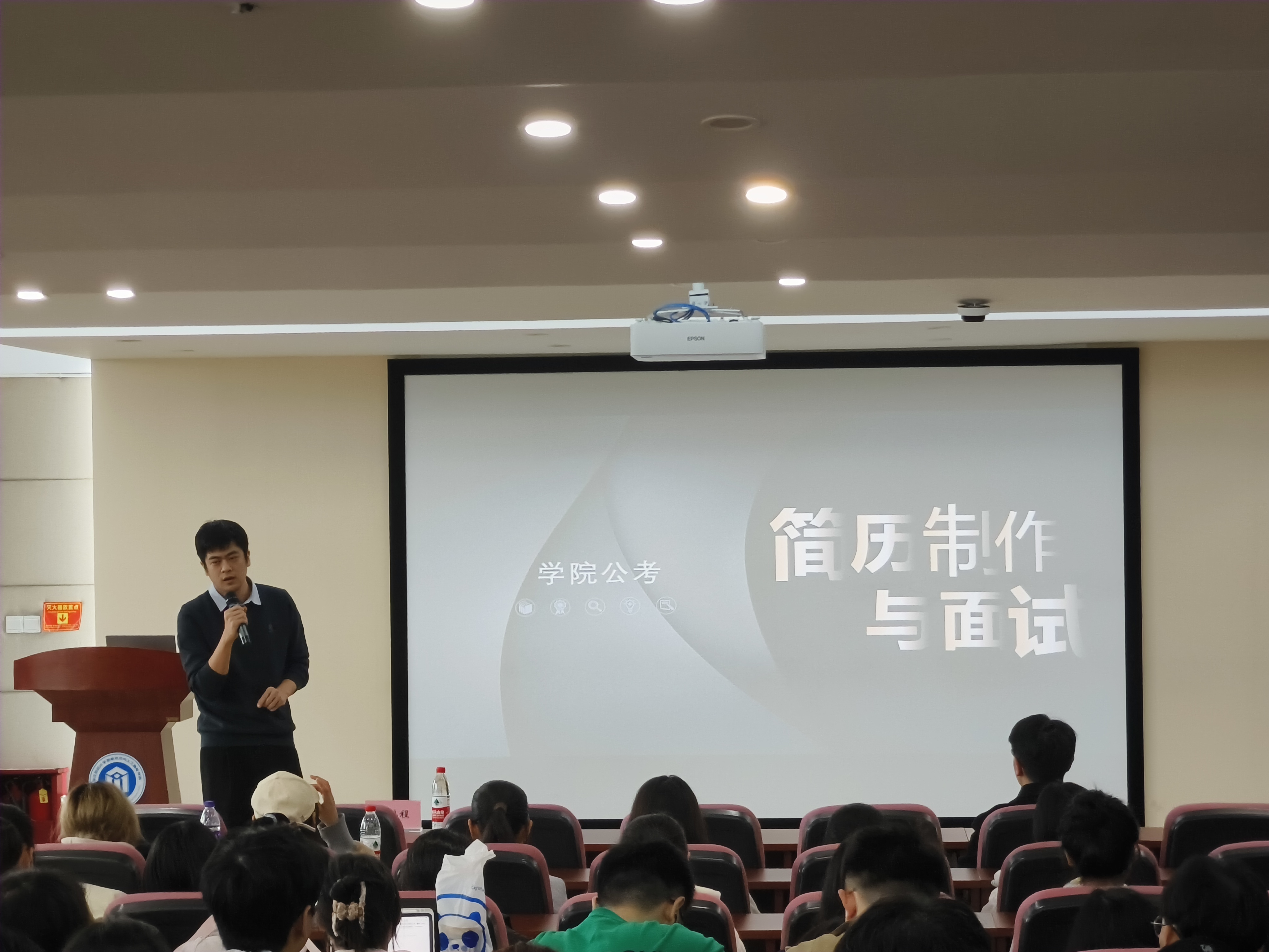 简历制作与优化实战专题讲座在学院9号楼302报告厅顺利举行。本期讲座由院团委学生会实践部承办,特邀学院公考(企业)教师苏鹏程主讲,院学办主任洪宝华与H次元