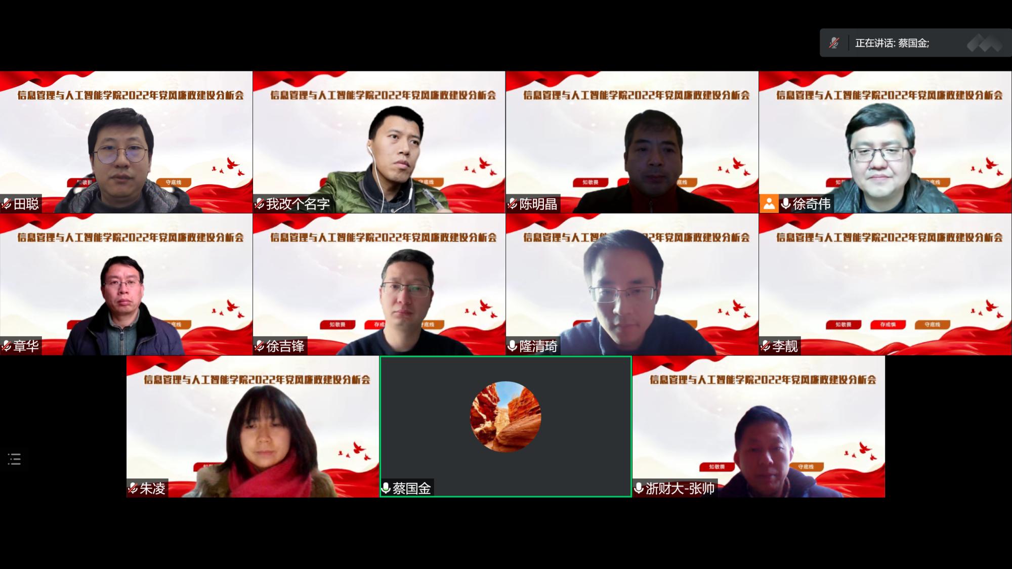 召开2022年度党风廉政建设情况分析会。校纪委委员、金融学院党委书记蔡国金,学院领导班子成员,学院党委委员、纪委委员出席会议。会议在线上举行,由学院党委书记徐奇伟主持。