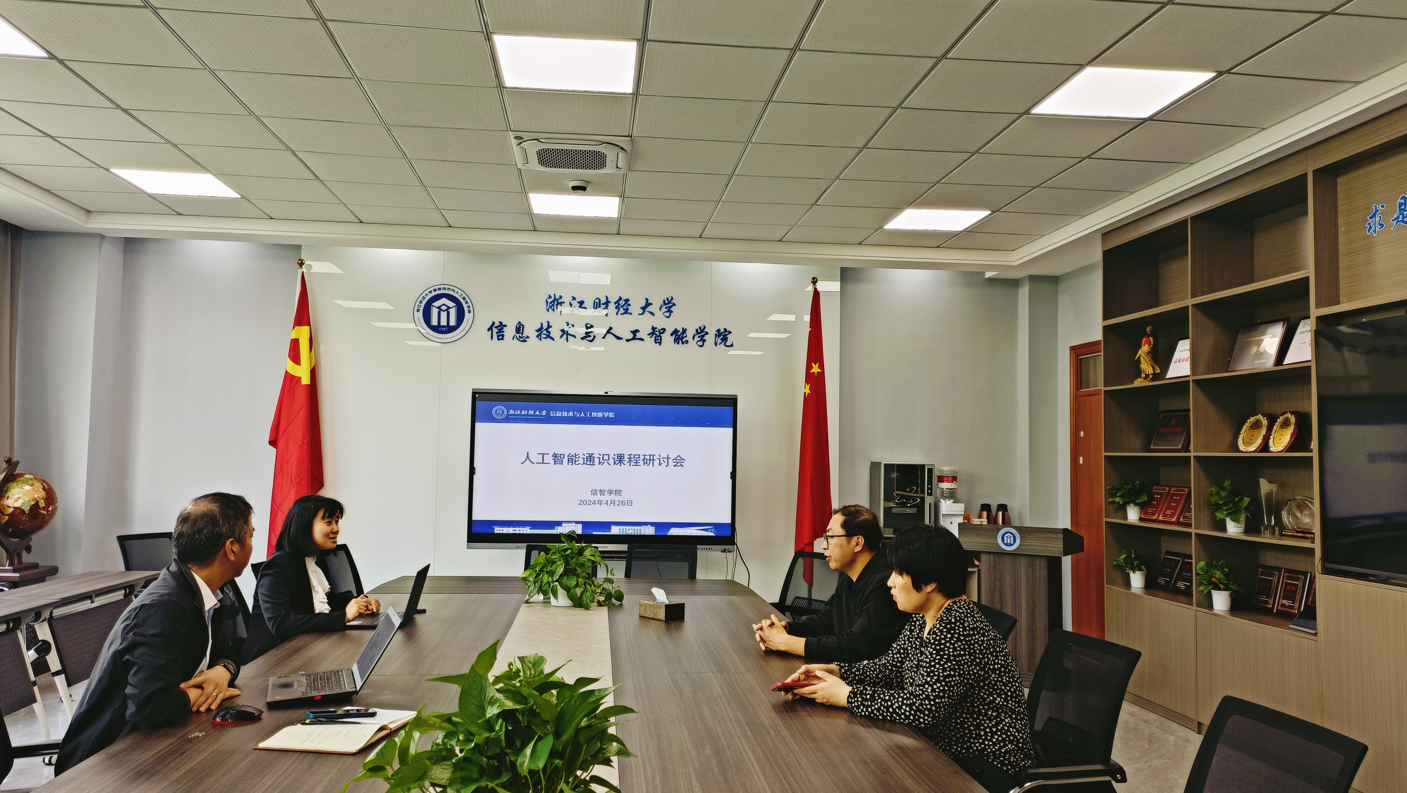 在9404召开人工智能通识课程研讨会。学院教学院长朱凌、院长助理陈明晶、人工智能通识课程骨干教师刘亚楠、高刚毅参会,研讨会由朱凌主持。