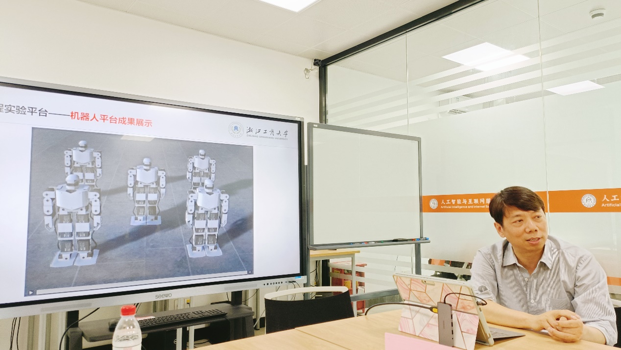 指导交流,介绍其团队研发的Python+智能群体机器人虚拟仿真实验项目,该项目目前正在申报国家一流虚拟仿真实验课程。学院院长张帅、科研院长林剑、教学院长朱凌、院长助理陈明晶、实验中心主任章华及多位骨干教师参与了本次交流座谈。