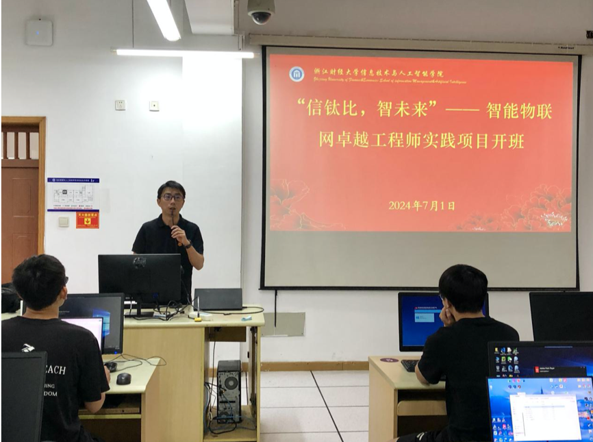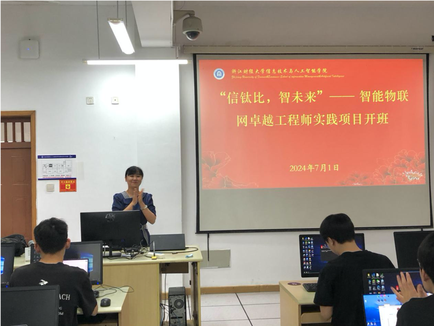 开班仪式伊始,杭州钛比科技有限公司总经理潘骏先生亲临现场并发表了热情洋溢的讲话。他介绍了杭州钛比科技在智能物联网领域的深厚底蕴和卓越成就,强调了人工智能、物联网技术在当今社会的重要性和广泛应用。潘总表示,杭州钛比科技将全力支持学院的教学工作,为学生提供优质的实践平台和丰富的实践机会。