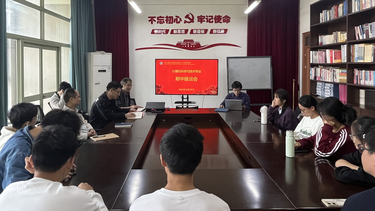 1029日,计算机系在9-506举办2024-2025学年第1学期期中座谈会,计算机教师李一啸、陈明晶、姜罗罗、学办主任洪宝华、教学办孙山、实验中心王振华、张睿峰,以及24级计算机1-3学生代表参加了此次座谈会
