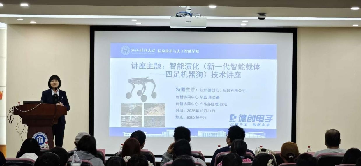 特邀杭州德创电子股份有限公司创新协同中心总监蒋金豪、产品部经理赵浩,在9302报告厅举办《智能演化(新一代智能载体)——四足机器狗技术讲座》。学院副院长朱凌主持讲座,院长助理/计算机系主任陈明晶、智能物联网及嵌入式开发课程资深教师张后旗、电子电路课程骨干教师杨泽、机器人课程骨干教师张翔等教师及相关本科生、研究生共130余人参与。