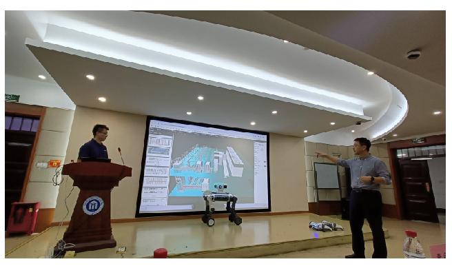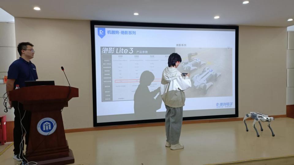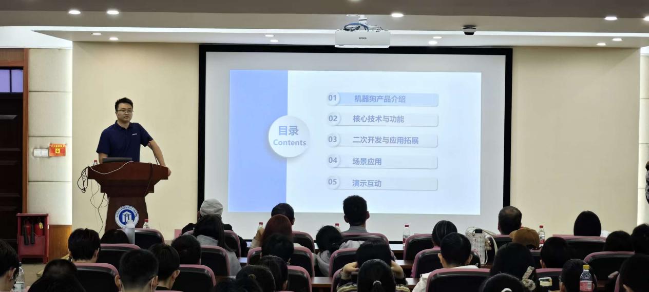 赵浩经理则聚焦技术落地与产业应用,以“四足机器狗:新一代智能载体的演化实践”为主题,从运动控制算法、多传感器融合等核心技术模块切入,详细讲解四足机器狗的关键功能;同时结合工业巡检、科研实验、应急救援等实际案例,深入剖析二次开发接口应用与定制化场景适配方案,为学院相关学科的科研与教学提供了鲜活的实践参考。