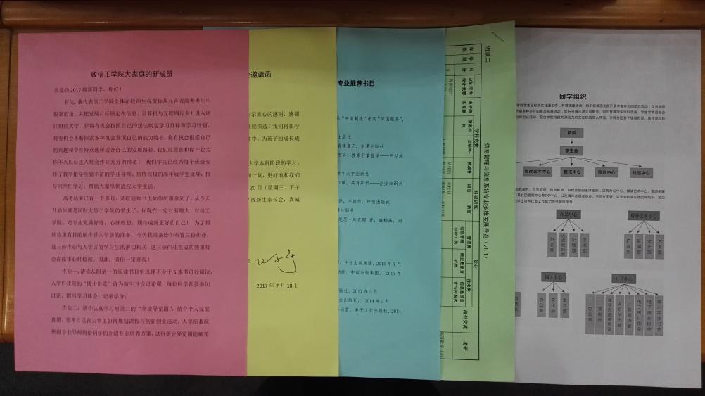 已向全国各地录取于信息管理与工程学院的新生寄发通知书,包括《录取通知书》、《信工学院2017级新生家长会邀请函》、《致信工学院大家庭的新成员》、《H次元