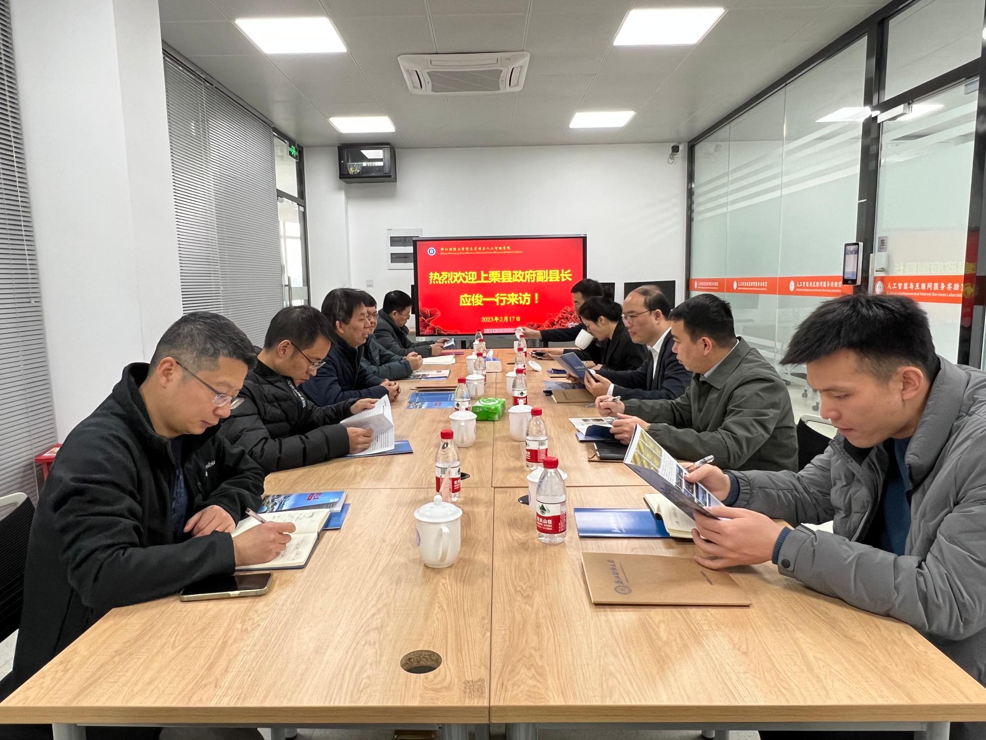 ,张帅院长代表学院对应俊一行的来访表示欢迎,并介绍了学院的基本情况。应俊对学院的热情接待表示感谢,他介绍了上栗县的基本情况,希望本次交流成为彼此密切联系,合作发展的开始。会上,双方围绕校地合作等方面进行了深入地交流和探讨。