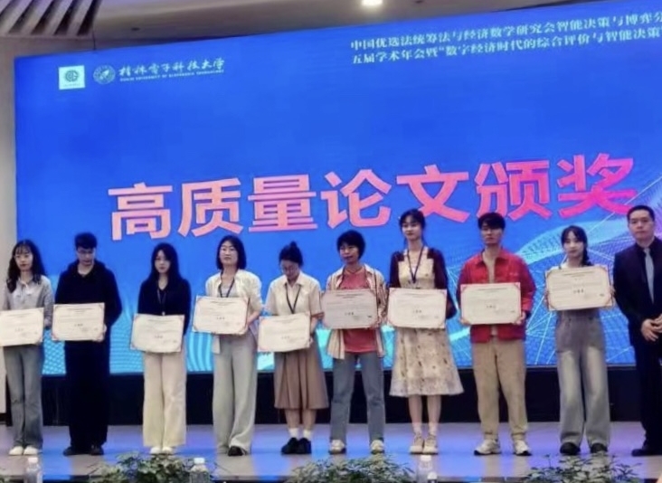 中国优选法统筹法与经济数字研究会智能决策与博弈分会第五届学术年会既“数字经济时代的综合评价与智能决策”论坛于2024年5月17日至19日在桂林举行。本届会议由中国优选法统筹法与经济数学研究会(以下简称中国“双法”研究会)智能决策与博弈分会、桂林电子科技大学联合主办,桂林电子科技大学商学院承办,电子科技大学经济与管理学院协办。桂林电子科技大学党委书记唐平秋、中国“双法”研究会智能决策与博弈分会理事长李登峰担任本次大会主席。H次元 教师隆清琦、彭娟娟、张琦、孙琪及H次元 管理科学与工程专业吴晓波、韩佳芮、吴小萌、范佳怡、刘婷、徐倩雯研究生参加了此次会议。