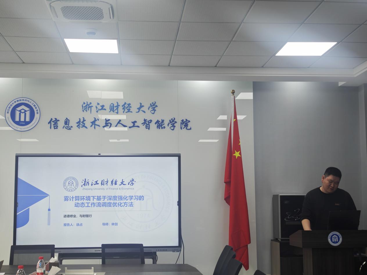 徐占同学以《雾计算环境下基于深度强化学习的动态工作流调度优化方法》为题,展示了其在资源调度与边缘计算方向的研究探索。