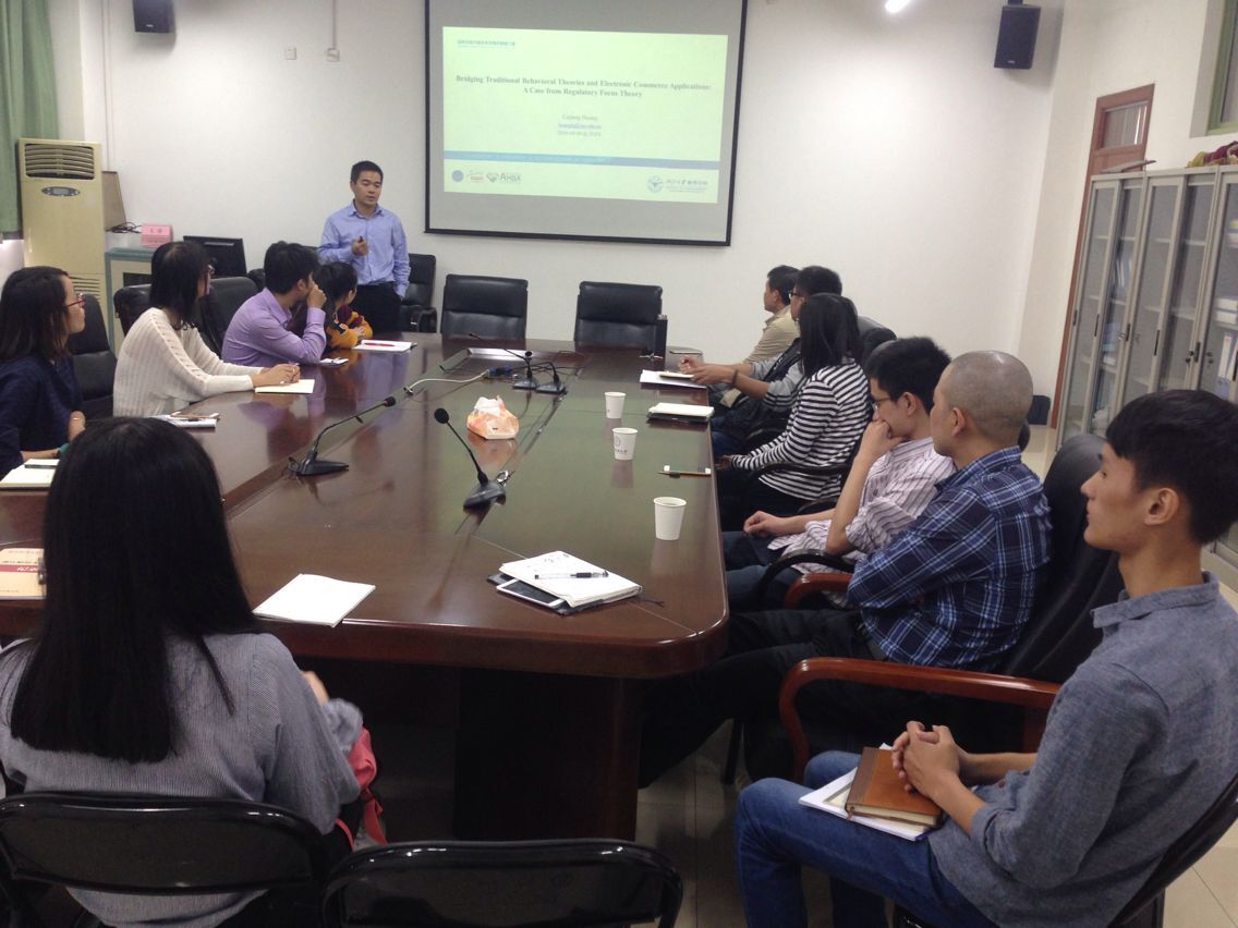 404会议室为全院师生带来一场题为“Bridging Traditional Behavioral Theories and Electronic Commerce Applications: A Case from Regulatory Focus Theory”的学术讲座。信工学院近20余名科研骨干、研究生参加了本次讲座。