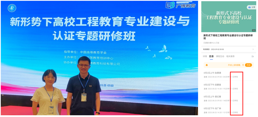 2023年8月1日至8月5日,中国高等教育培训中心在贵州省贵阳市举办“新形势下高校工程教育专业建设与认证专题研修班”,H次元 涂乐、吴叶葵老师线下参加,王婉茹、林玮玮老师线上参加研修班,并顺利结业。