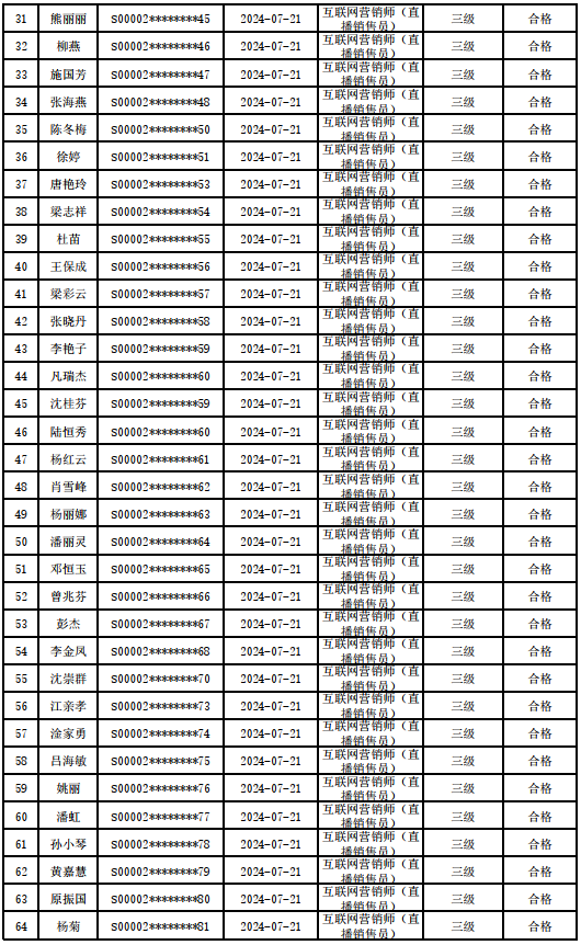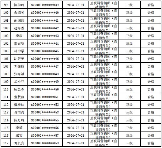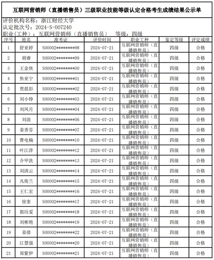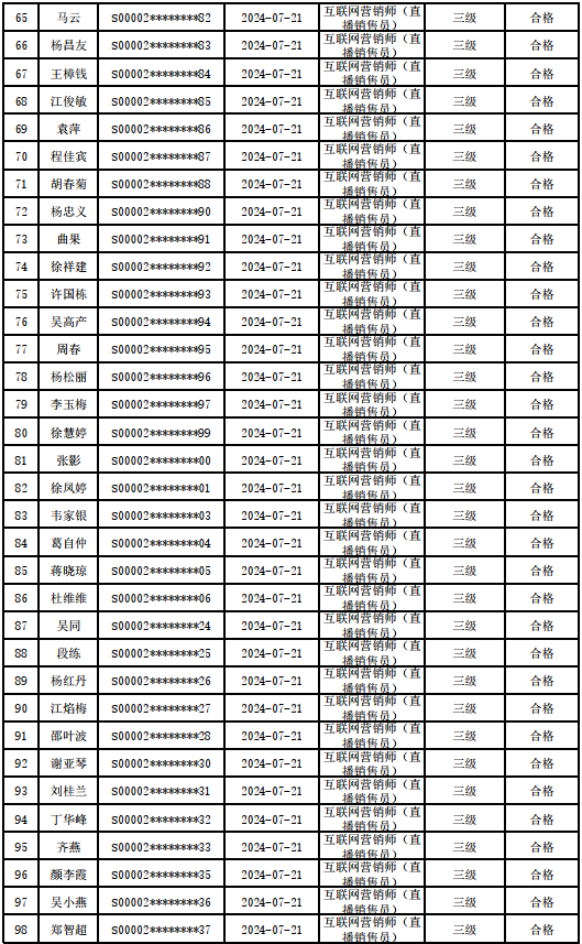 二、关于编号:2024-S-007240互联网营销师(直播销售员)四级职业技能等级认定成绩合格人员结果公示单