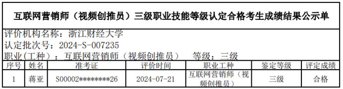 三、关于编号:2024-S-007235互联网营销师(视频创推员)三级职业技能等级认定成绩合格人员结果公示单
