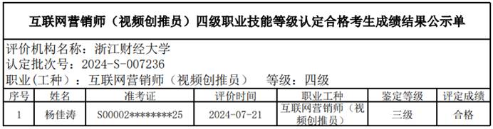 四、关于编号:2024-S-007236互联网营销师(视频创推员)四级职业技能等级认定成绩合格人员结果公示单