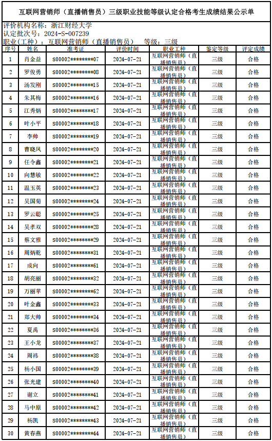 一、关于编号:2024-S-007239互联网营销师(直播销售员)三级职业技能等级认定成绩合格人员结果公示单