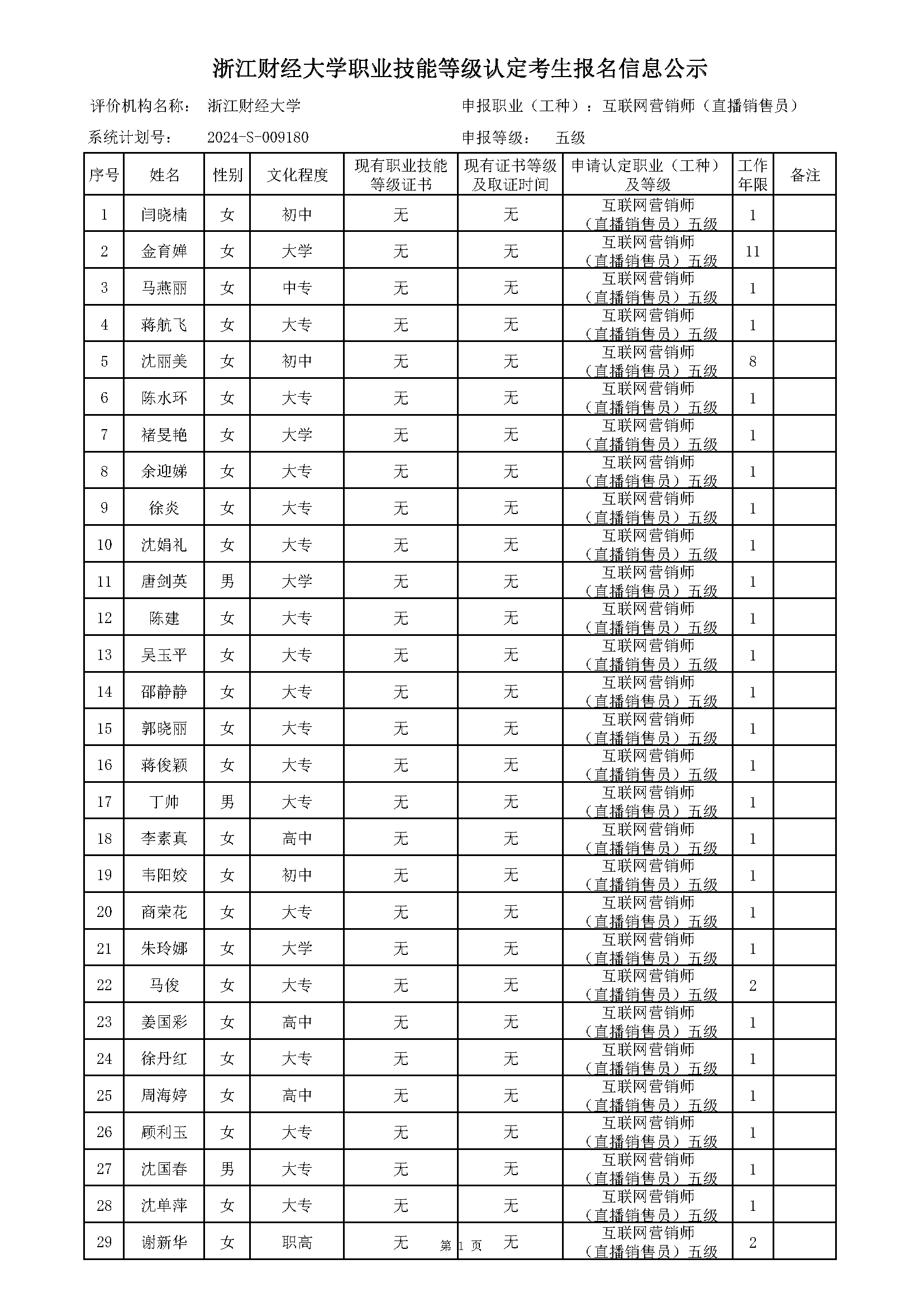 计划编号:2024-S-009180H次元 海宁市考点(东方学院考点)9月份互联网营销师(直播销售员)五级职业技能等级认定考生资格审核结果公示