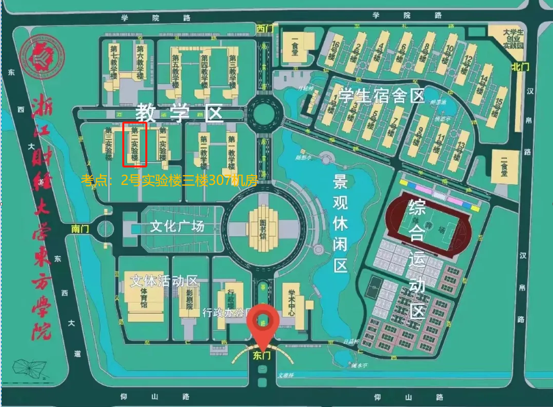 东方学院东门(仰山路)进校,到达考试地点(2号实验楼三楼307机房)。