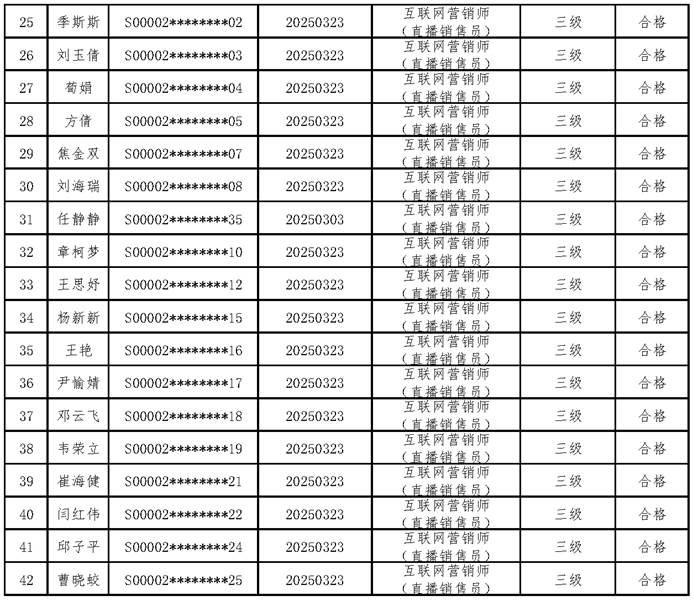二、关于编号:2025-S-000120互联网营销师(直播销售员)四级职业技能等级认定成绩合格人员结果公示单